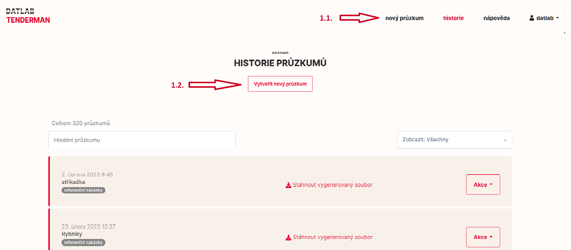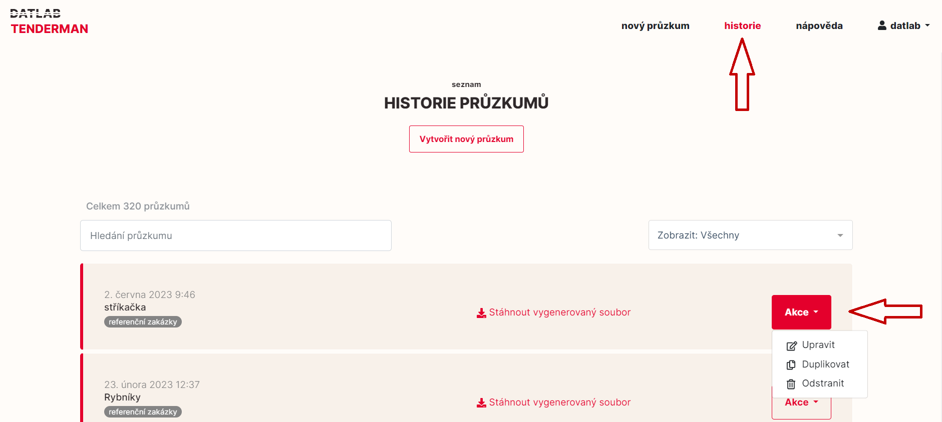 Seznam všech Vašich uložených průzkumů je dostupný z menu pod volbou “historie”.