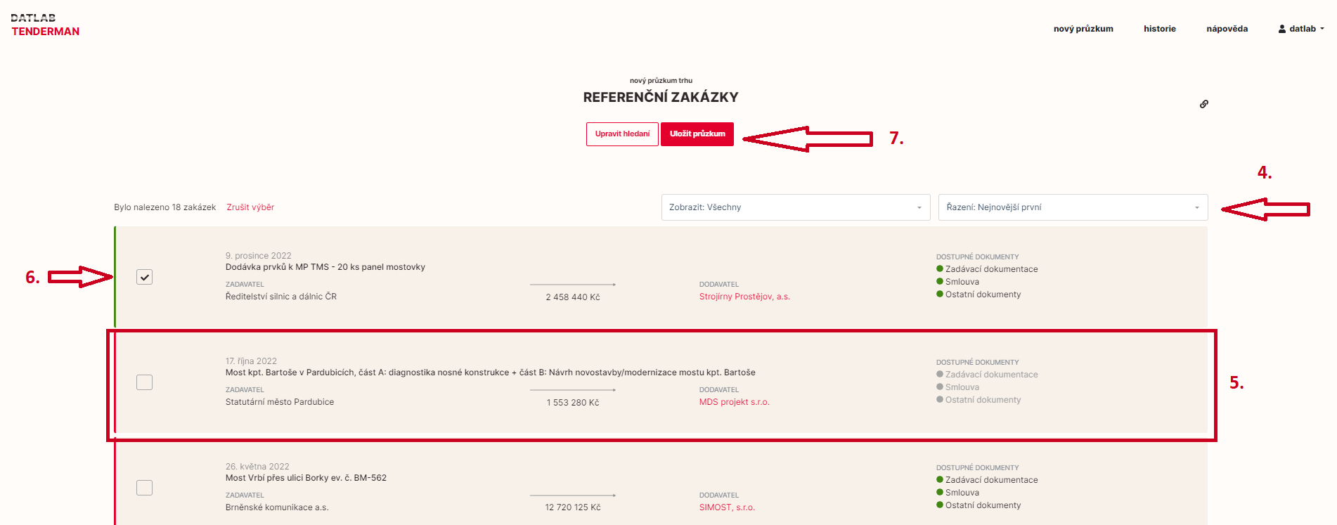 Vytvořte nový průzkum typu “referenční zakázky” a při nastavování parametrů zaškrtněte volbu “Zadávací dokumentace”.