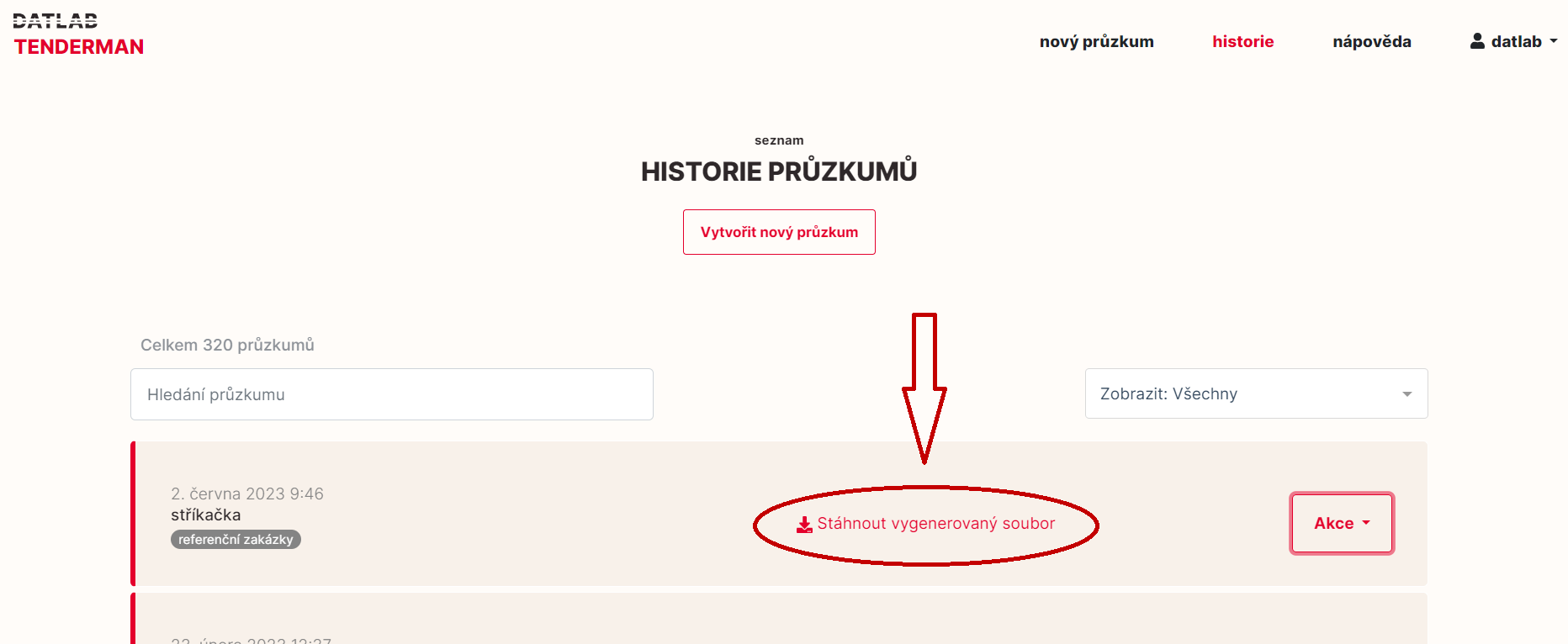 Pokud jste si při ukládání průzkumu neuložili soubor do počítače, můžete jej kdykoli znovu stáhnout z historie Vašich průzkumů kliknutím na “Stáhnout vygenerovaný soubor” a vytisknout.