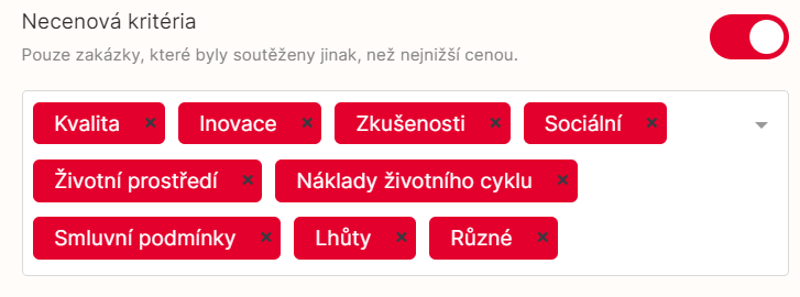 Vytvořte nový průzkum typu “referenční zakázky” a při nastavování parametrů zaškrtněte volbu “Necenová kritéria” (můžete si vybrat z řady necenových kritérií).